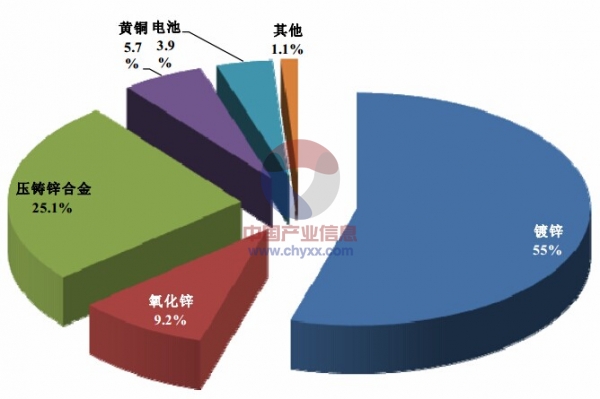 锌的初级消费领域主要是镀锌、压铸合金、黄铜、氧化锌以及电池。其中镀锌占我国锌消费的一半以上。2013年,我国锌的消费结构如下: